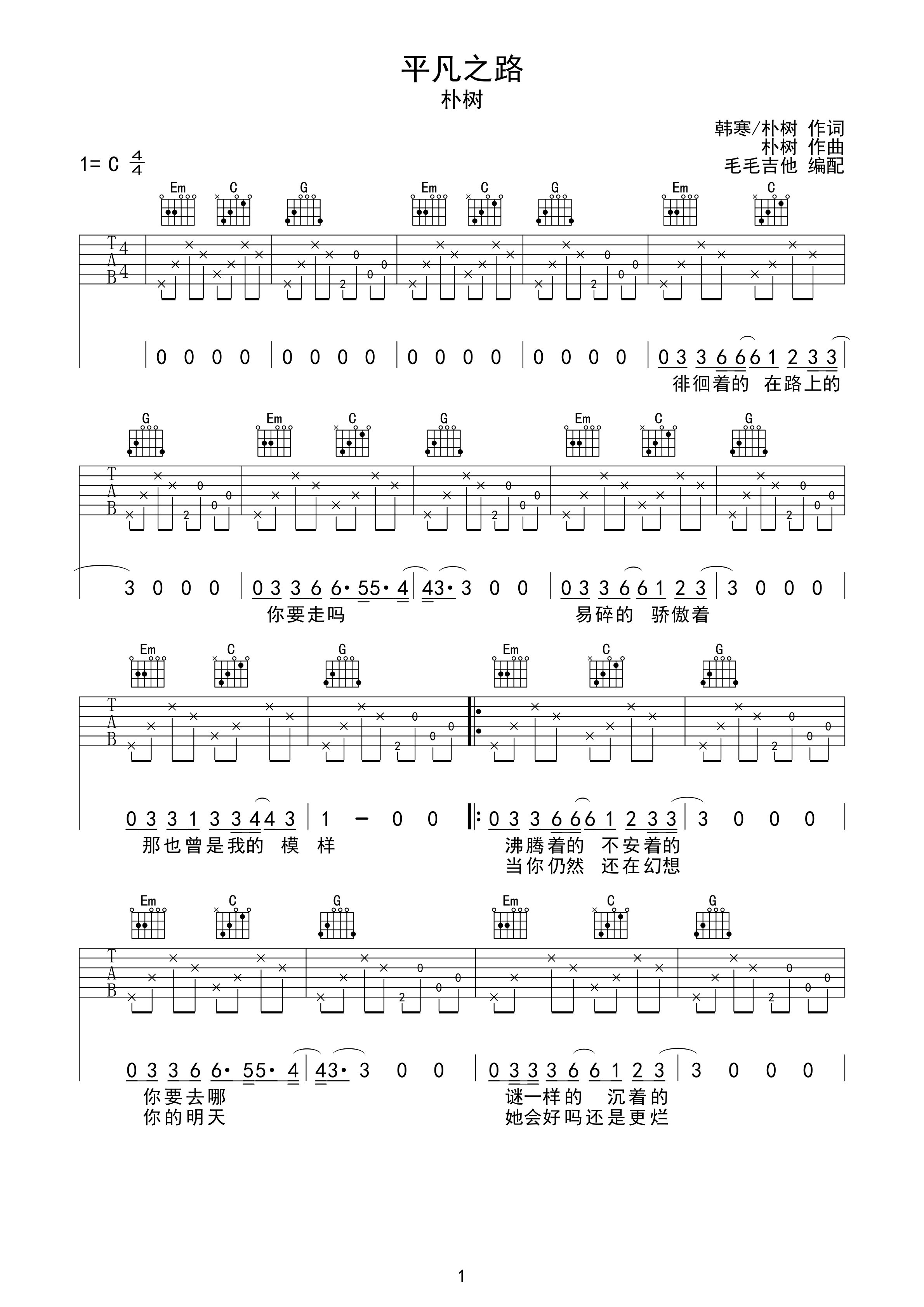 《平凡之路吉他谱》_朴树_c调_吉他图片谱2张 图1