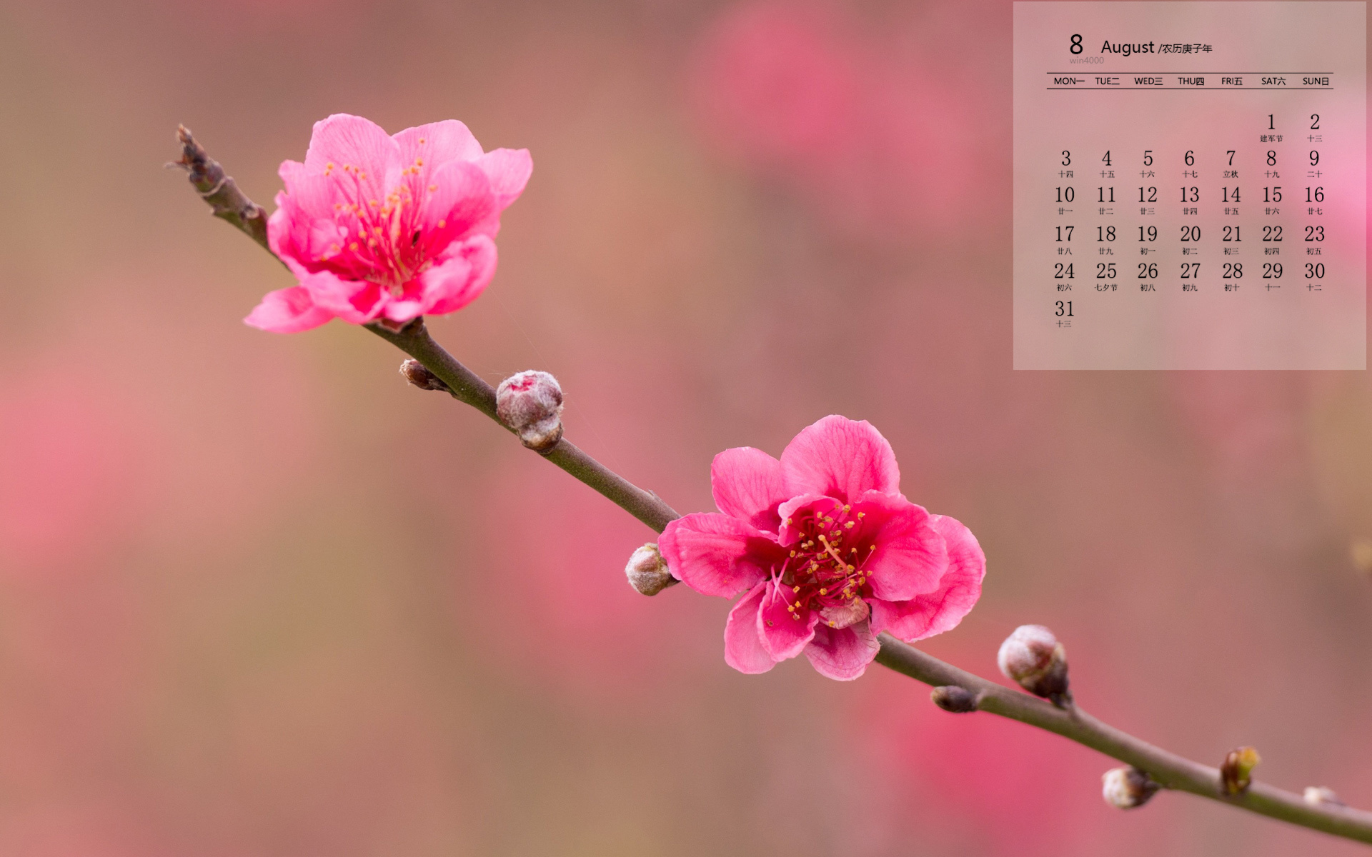 2020年8月唯美粉嫩的桃花日历壁纸