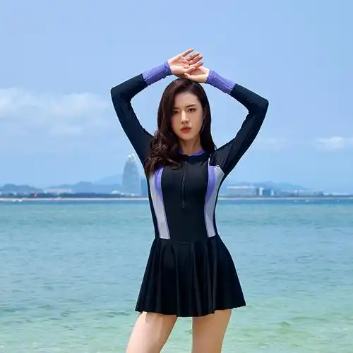 24新款连体泳衣女修身显瘦撞色泳衣时尚保守高弹力长袖款拉链泳装