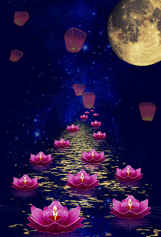 中元节屋檐古风建筑孔明灯夜景原创插画背景素材