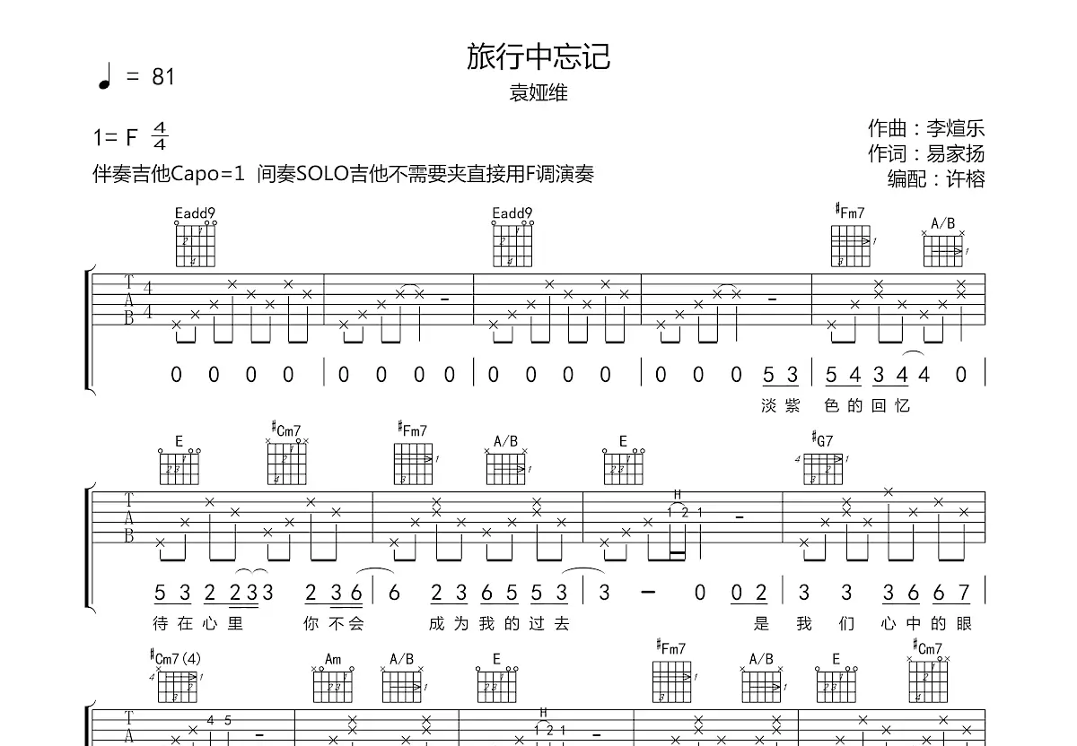 袁娅维《旅行中忘记》尤克里里弹唱谱