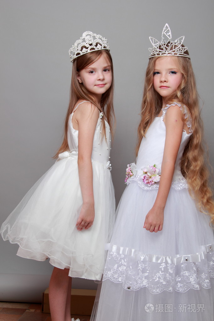 迷人和优雅的小女孩身穿白衣头戴皇冠的美丽和时尚