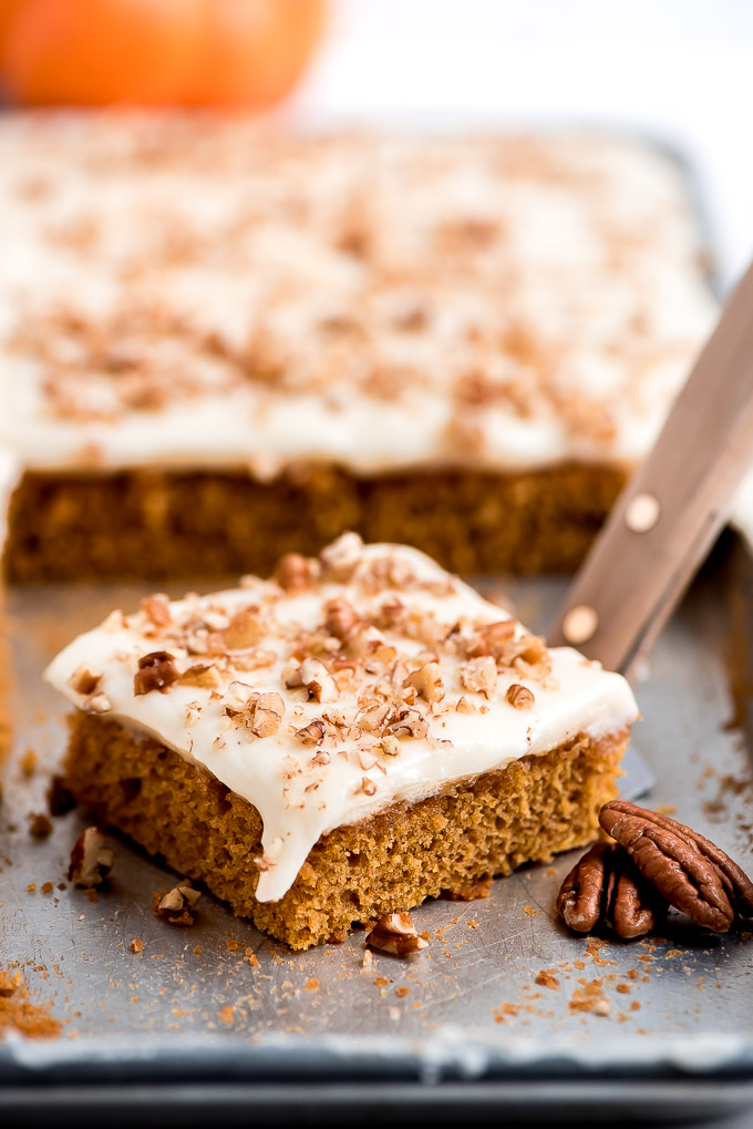 lifting a piece of pumpkin sheet cake with cream cheese frosting