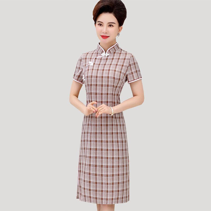 中老年夏装中长款旗袍式连衣裙女新款旗袍裙妈妈中国风格子棉旗袍