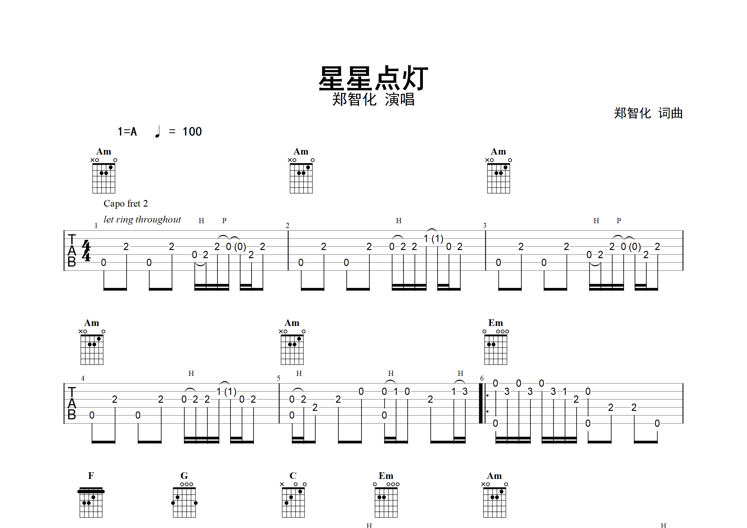 星星点灯吉他谱(图片谱,简单版,改编版,独奏)_郑智化