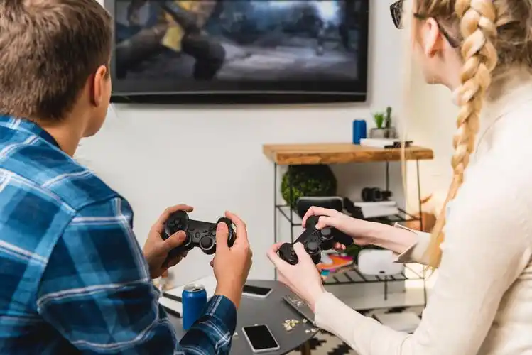 两个玩电子游戏的青少年的背影