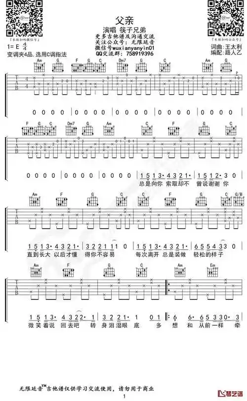 筷子兄弟父亲吉他谱c调变调夹四品capo4高清六线图片弹唱谱子老歌大叔