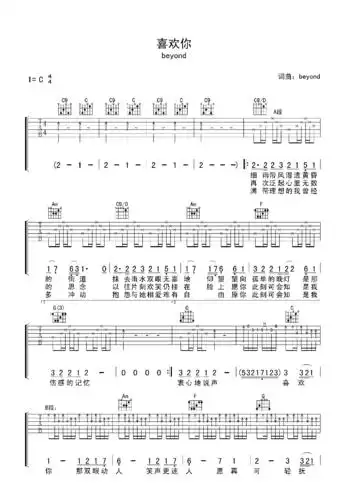 《喜欢你》吉他谱六线谱原版c调-beyond乐队