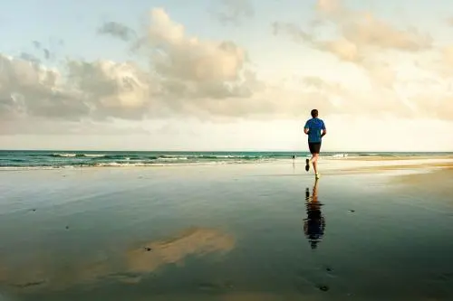 在海滩上跑步的男人的背影