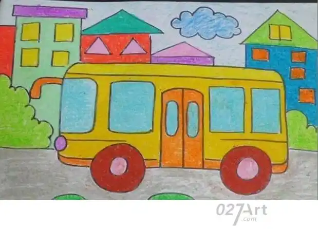公交车来了交通工具儿童画教师范画 — 儿童蜡笔画图片大全
