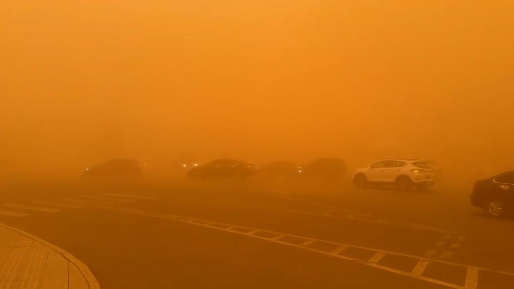 锡林郭勒部分地区出现强沙尘暴天气天空变成橘红色,当地发布停工,停课