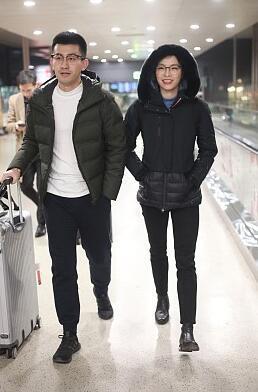 吴敏霞和丈夫走机场,穿棉服麻杆腿好惹眼,难得浓妆红唇气质大变_老公