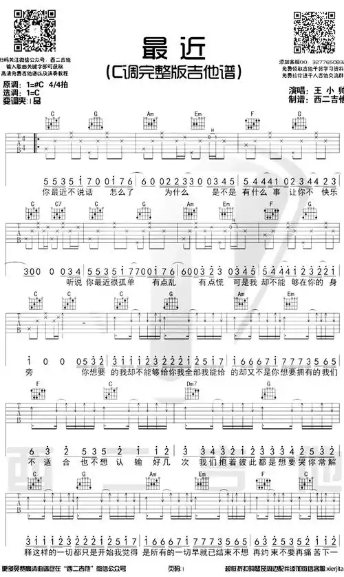 最近吉他谱 c调完整版 王小帅版本 吉他谱教学视频1