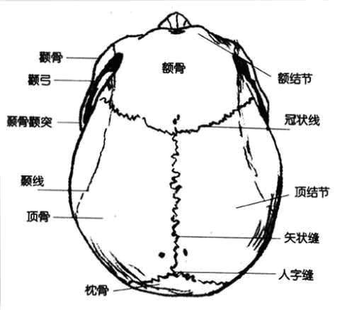 顶骨,颞骨鳞部和枕骨拼合而成,这些颅骨之间由颅缝和囟门连接