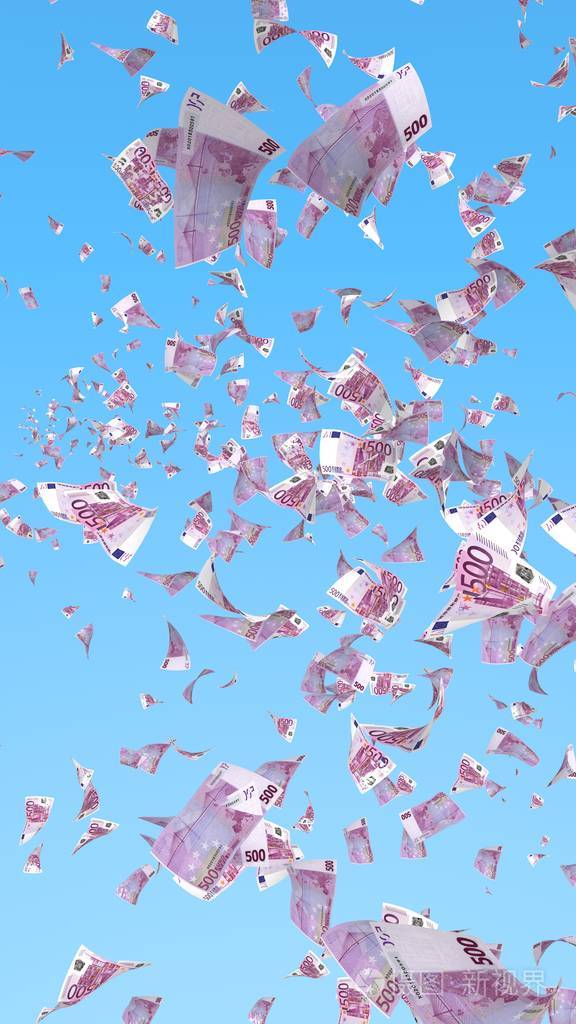 天空背景下飞扬的欧元钞票.钱在天上飞.500欧元的颜色.三维插图