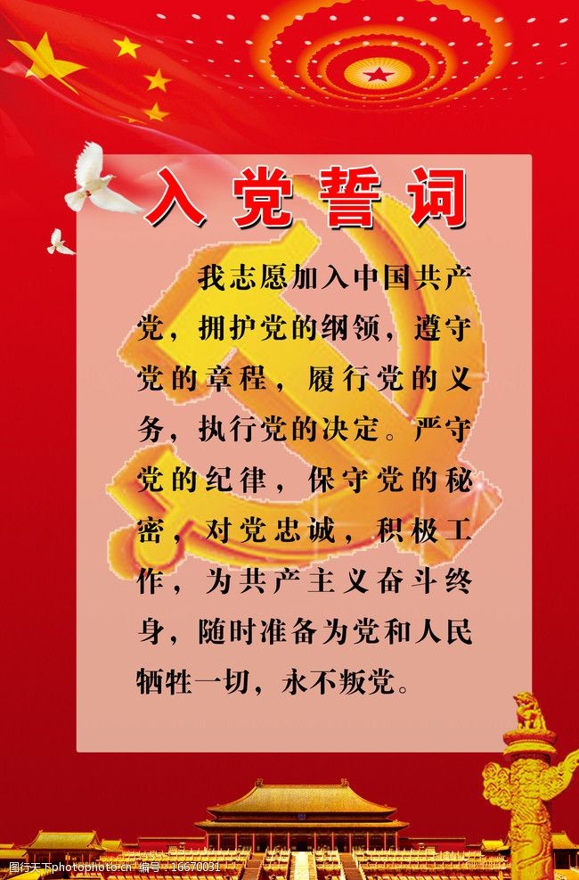 入党誓词 誓词 党徽 五角星 白鸽 长城 山峦 黄昏 文字 图片 图形