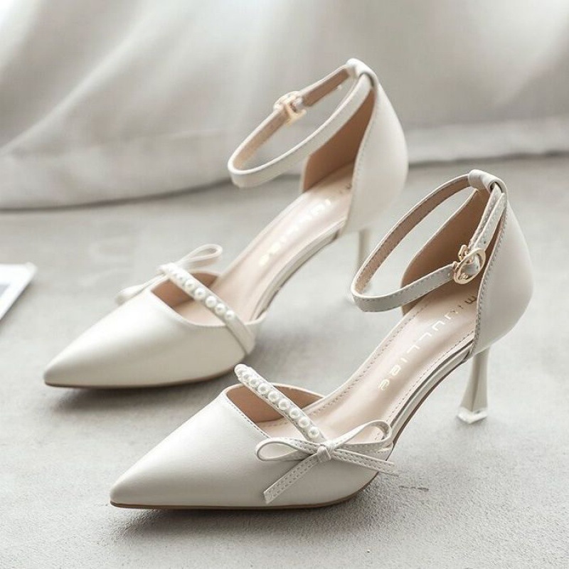 白色真皮尖头高跟鞋细跟一字扣带春秋季新款女士气质珍珠单鞋浅口