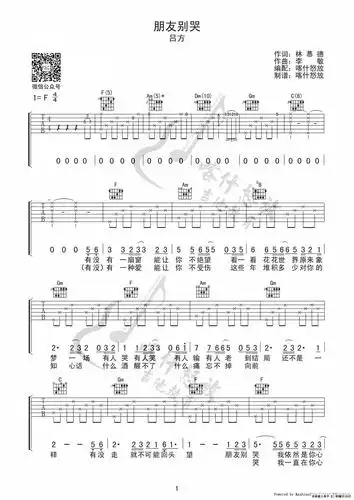 朋友别哭吉他谱_吕方_高清弹唱谱_f调六线谱完整版