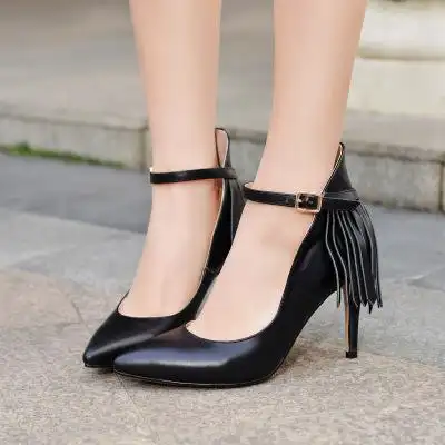 欧美2016秋季新款潮真皮流苏女鞋 时尚尖头一字扣细高跟ol单鞋