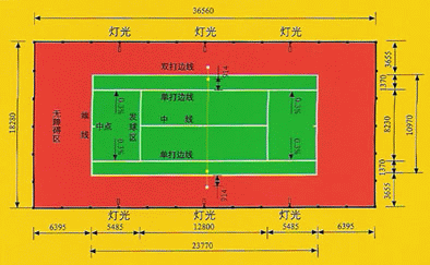 网球场标准尺寸:网球场是一个长方形场地,长36.58 米,宽18.29 米.