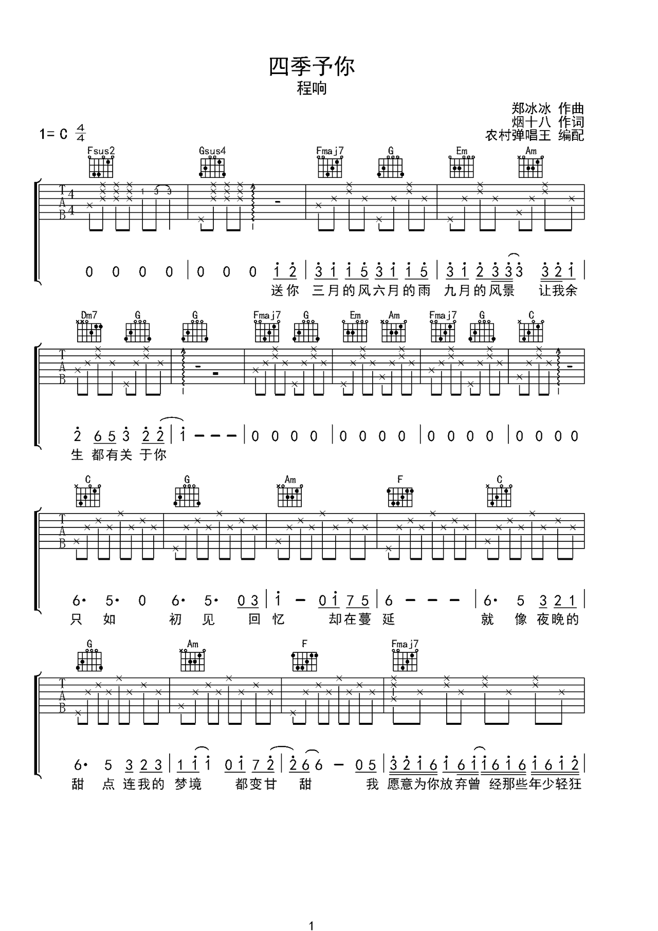 四季予你简谱-程响演唱-烟十八/郑冰冰词曲1