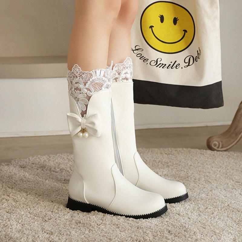 子白色公主冬靴皮靴儿童棉靴中大童高筒靴女孩过膝长筒靴瑞央 白色 29