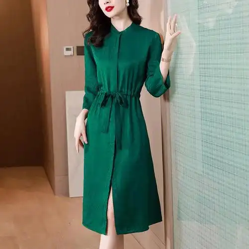 高端真丝连衣裙新款气质醋酸提花系带收腰中长裙