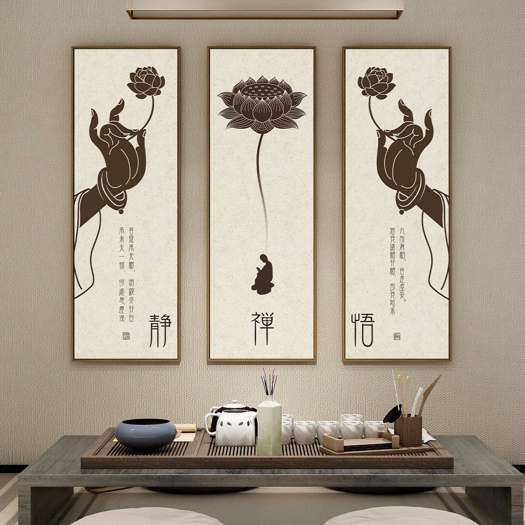 新中式茶室禅意贴画中国风佛手莲花客厅背景墙面装饰画瑜伽馆壁画
