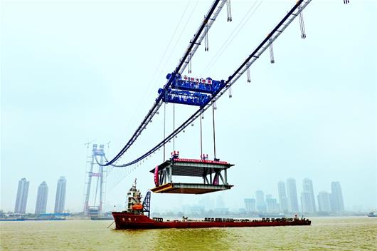 图文:千吨钢梁长江上"吊威亚" 杨泗港长江大桥桥面主体开始施工