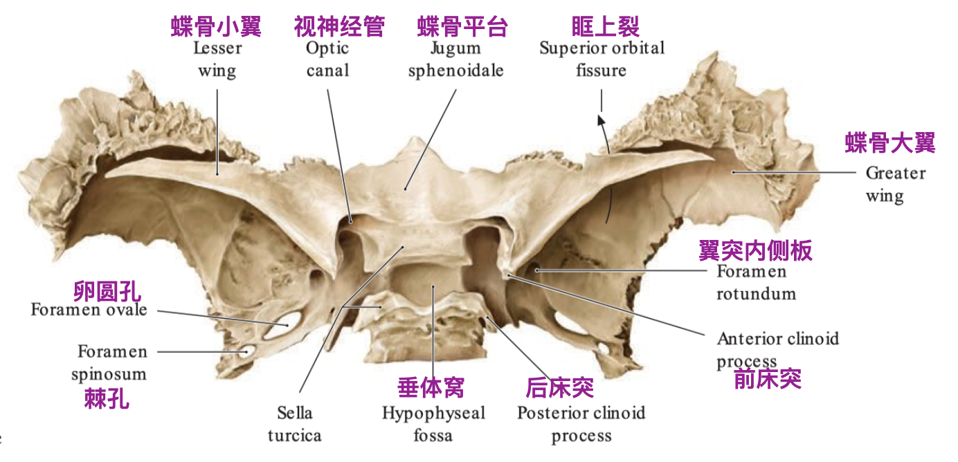 蝶骨: 体(蝶窦): 蝶鞍,垂体窝 小翼:视神经管,眶上裂 大翼:圆孔,卵