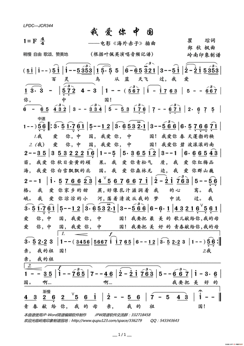 我爱你中国(电影《海外赤子》插曲)简谱-叶佩英演唱-岭南印象制作曲谱