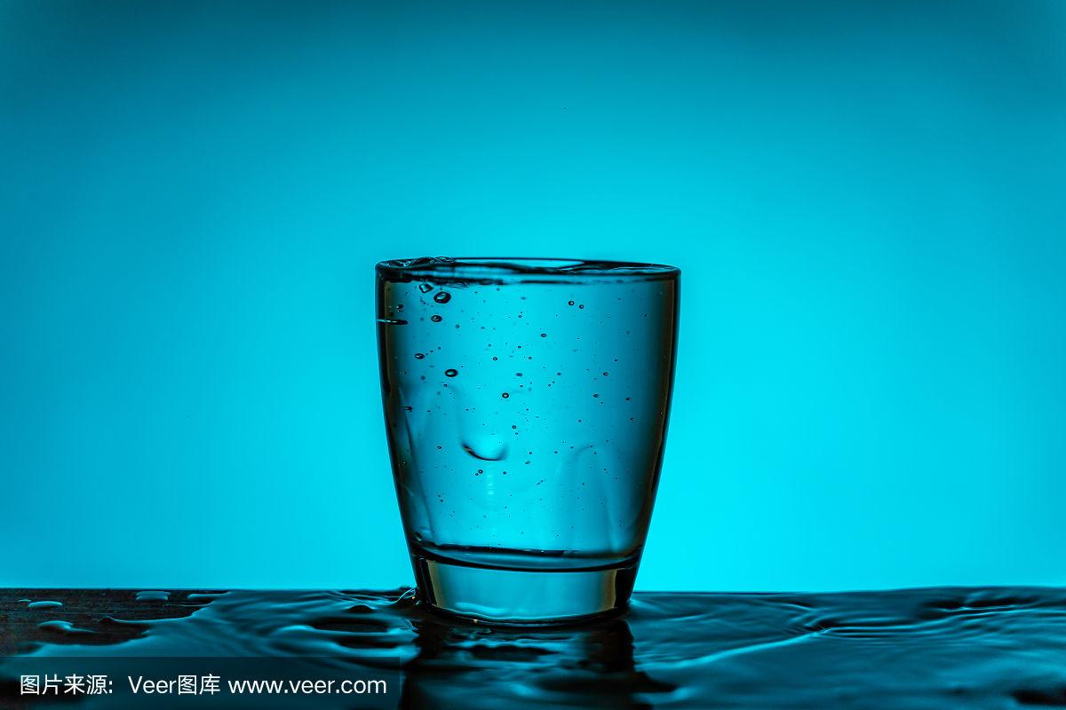 杯子里装满了水,背景是蓝色