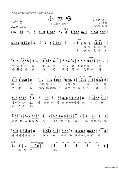 小白杨(梁上泉词士心曲)简谱-佚名演唱-岭南印象制作曲谱1