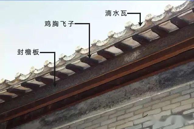 从外到内分别是:滴水瓦,鸡胸飞子,封檐板.