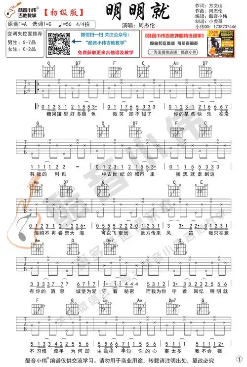 明明就吉他谱_周杰伦_g调图片谱完整版