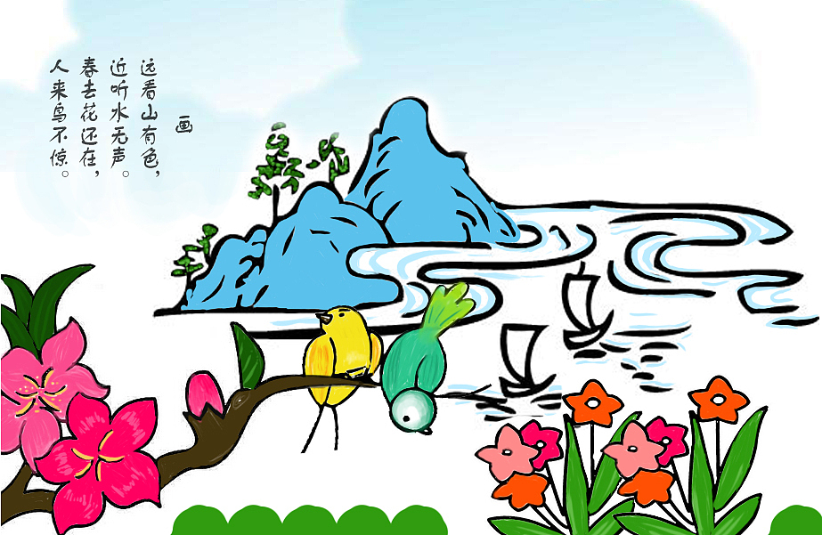 古诗《画》的配图 br>远远的大山,滔滔的江水.鲜艳的花朵,俏皮的小鸟.