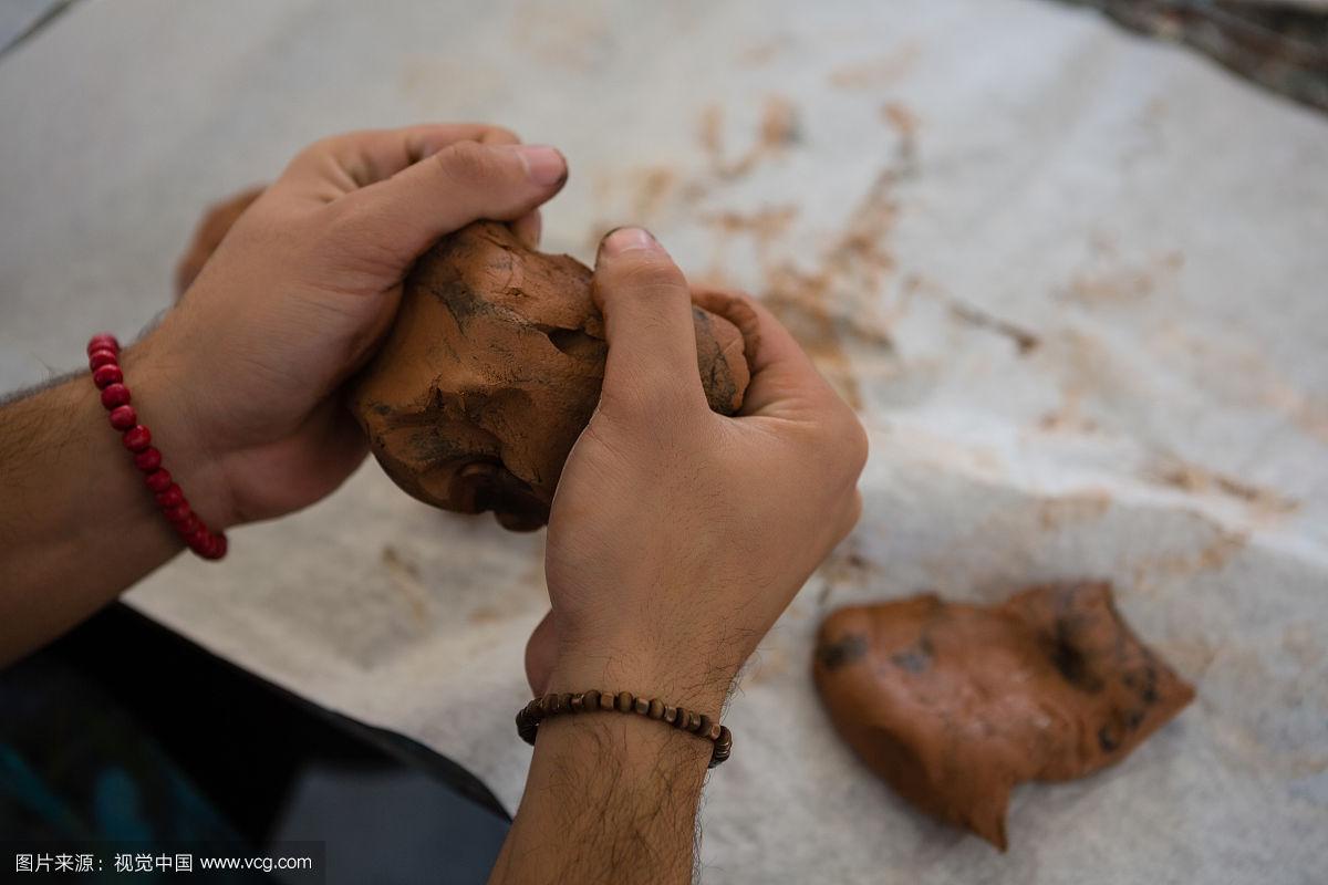 制作泥塑的人的手.