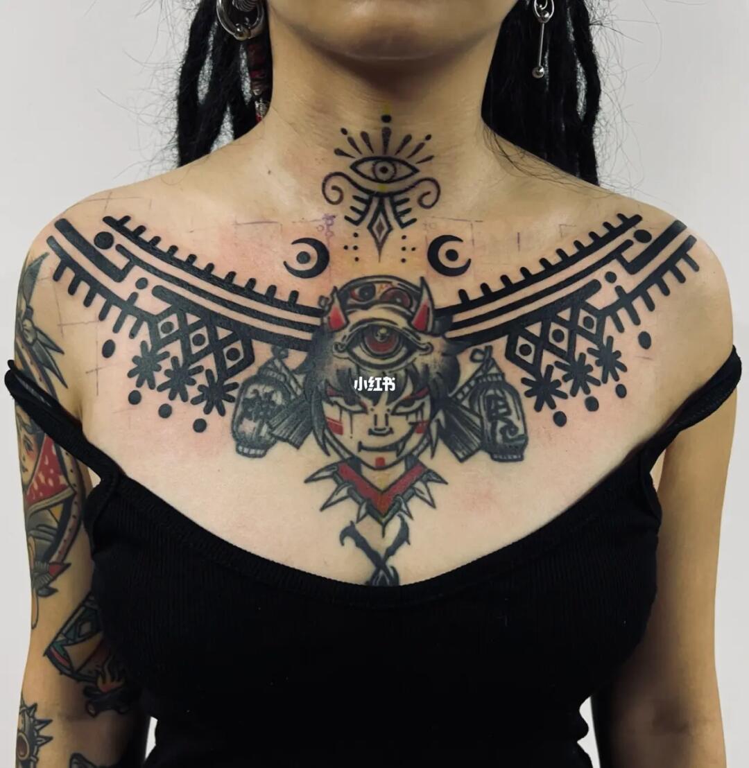 胸口大v纹身图腾点刺纹身美女胸口纹身