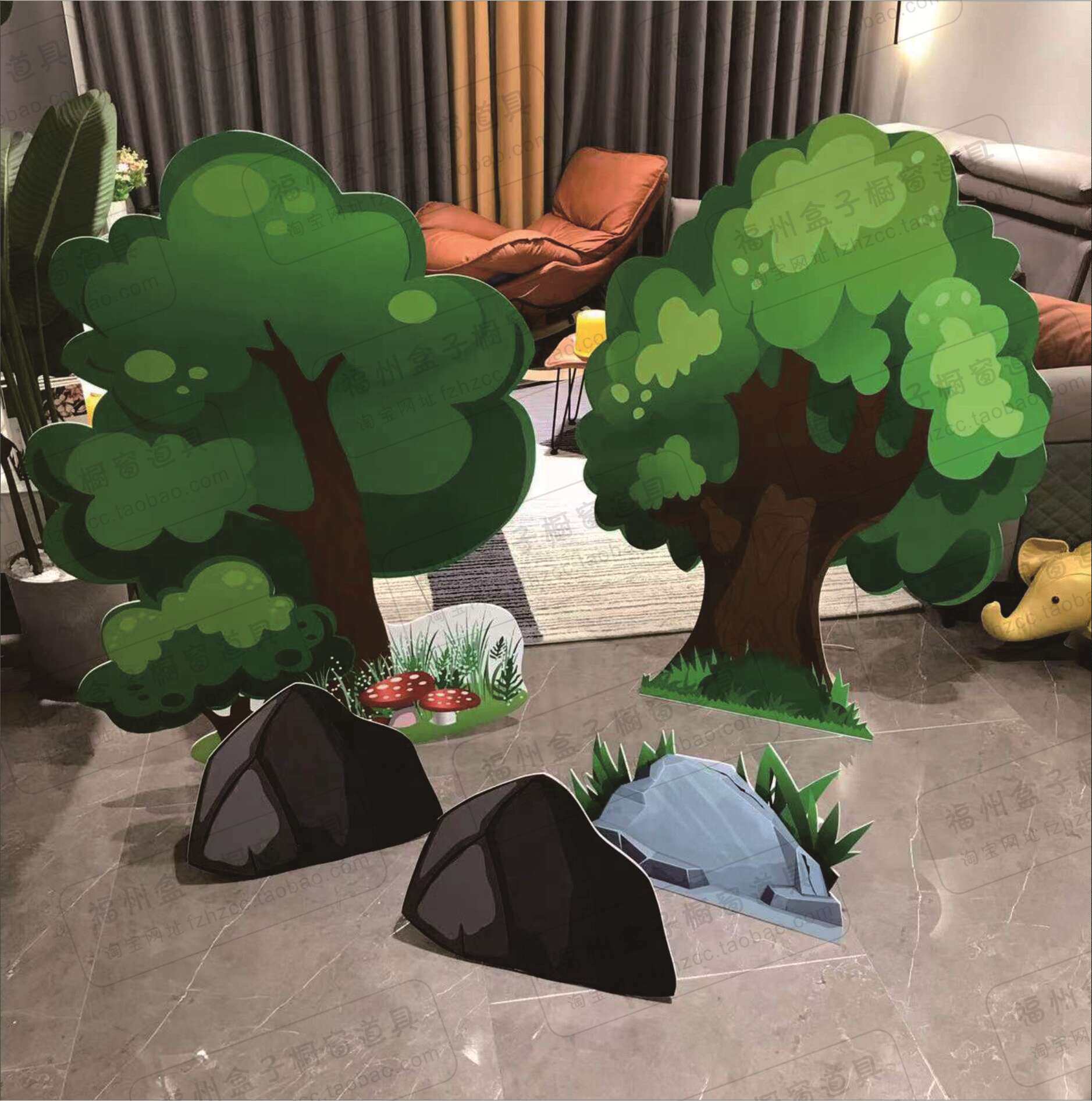 大树花草丛山幼儿童情景舞台剧道具kt板卡通森林蘑菇房子大树花草丛山