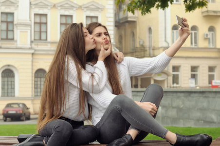两个女朋友亲吻他们的嘴唇, 而他们做一个 se照片