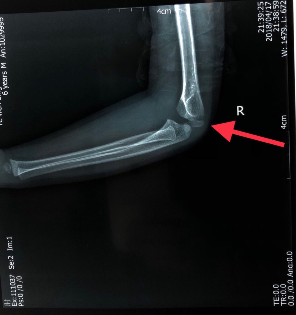 6岁儿童,右侧肱骨外髁骨折,采用小切口复位可吸收棒固定