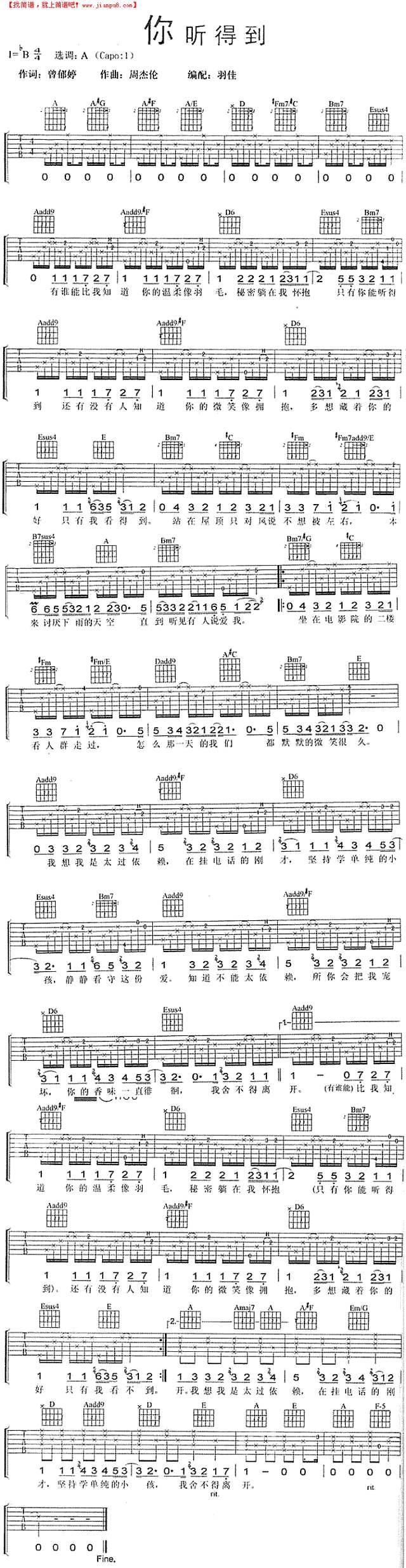 《你听得到》吉他谱-周杰伦-高清六线谱图片谱