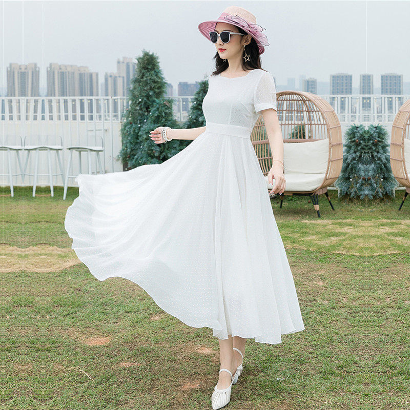 白色雪纺连衣裙女夏气质收腰显瘦超长大摆裙仙女沙滩长裙2019新款