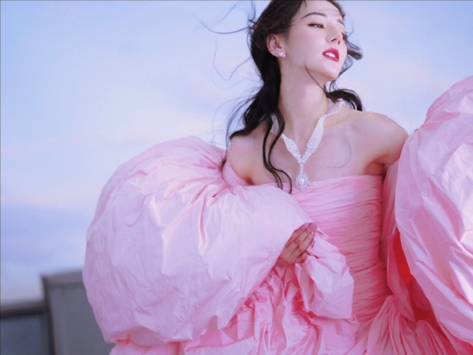 迪丽热巴一袭粉色长裙,裙摆轻盈飘逸,宛如仙女下凡