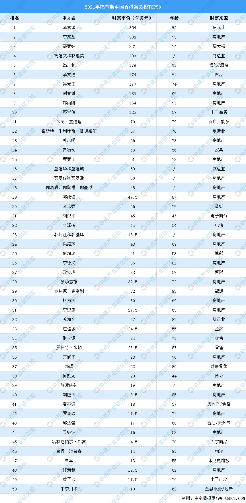 2021年福布斯中国香港富豪榜top50(附榜单)