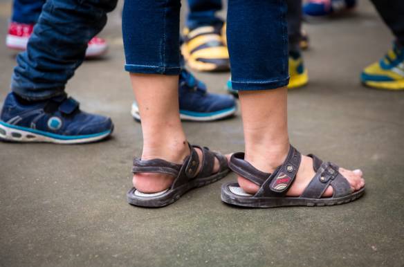 孩子们在冬天仍穿着凉鞋