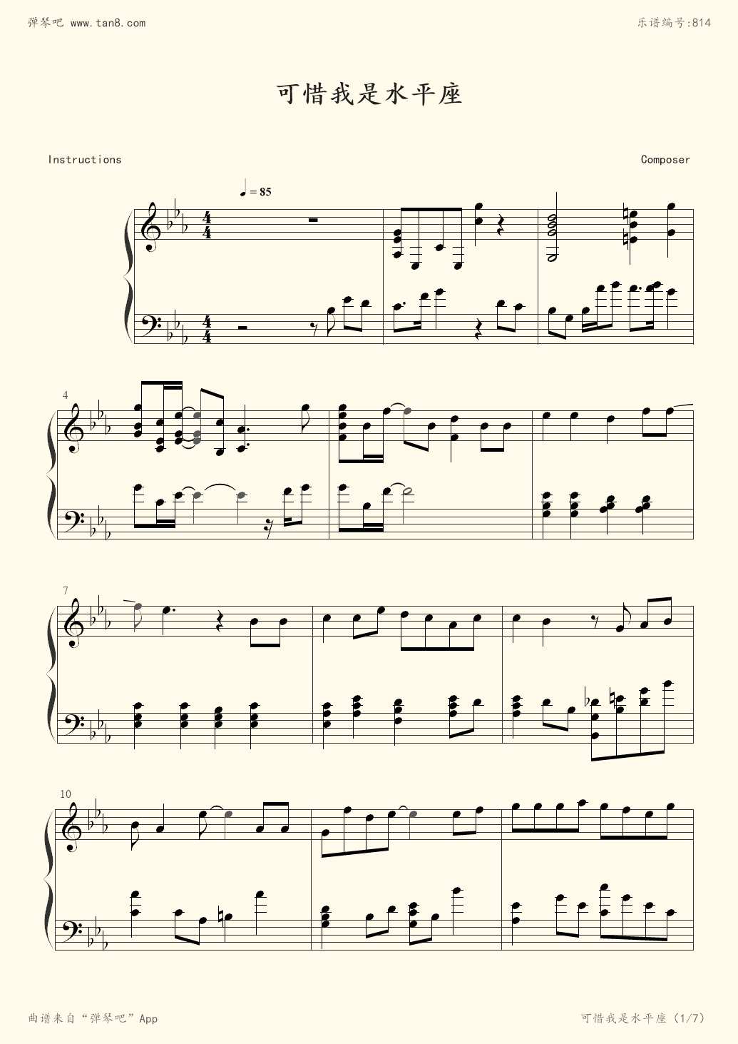 我是水瓶座,钢琴谱》杨千烨|弹吧|钢琴谱|吉他谱|钢琴曲|乐谱|五线谱