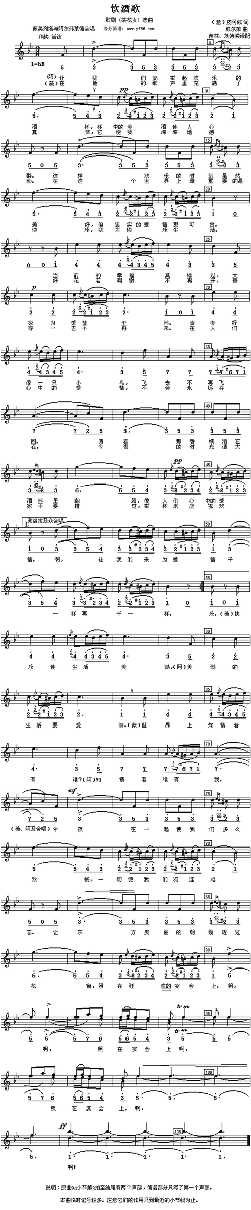 饮酒歌 茶花女 选曲 歌谱 简谱,五线谱