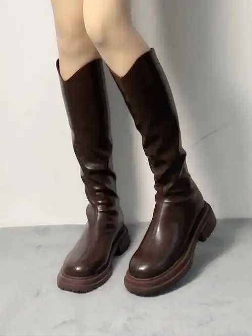 棕色靴子高筒骑士靴女2023年新款长靴膝长筒靴粗跟显瘦英伦马丁靴