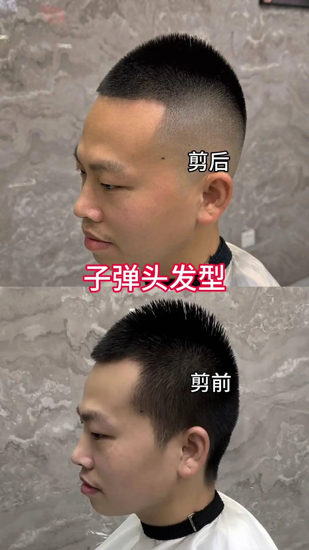 大家可以试试上面这款子弹头发型,这款发型从寸头改变而来的,两边推得